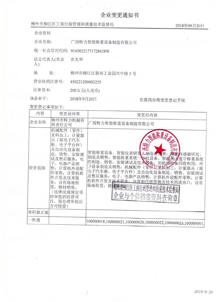 從2018年9月20日起,將原公司名稱“柳州市特力機械有限責任公司”變更登記為“廣西特力智能稱重設(shè)備制造有限公司”。公司稅務(wù)方面相關(guān)變更事宜正在辦理,在辦理完結(jié)前公司無法開票,待辦理完結(jié),公司另行通知各位。公司更名后,業(yè)務(wù)主體和法律關(guān)系不變,原簽訂的合同繼續(xù)有效,原有的業(yè)務(wù)關(guān)系和服務(wù)承諾保持不變。